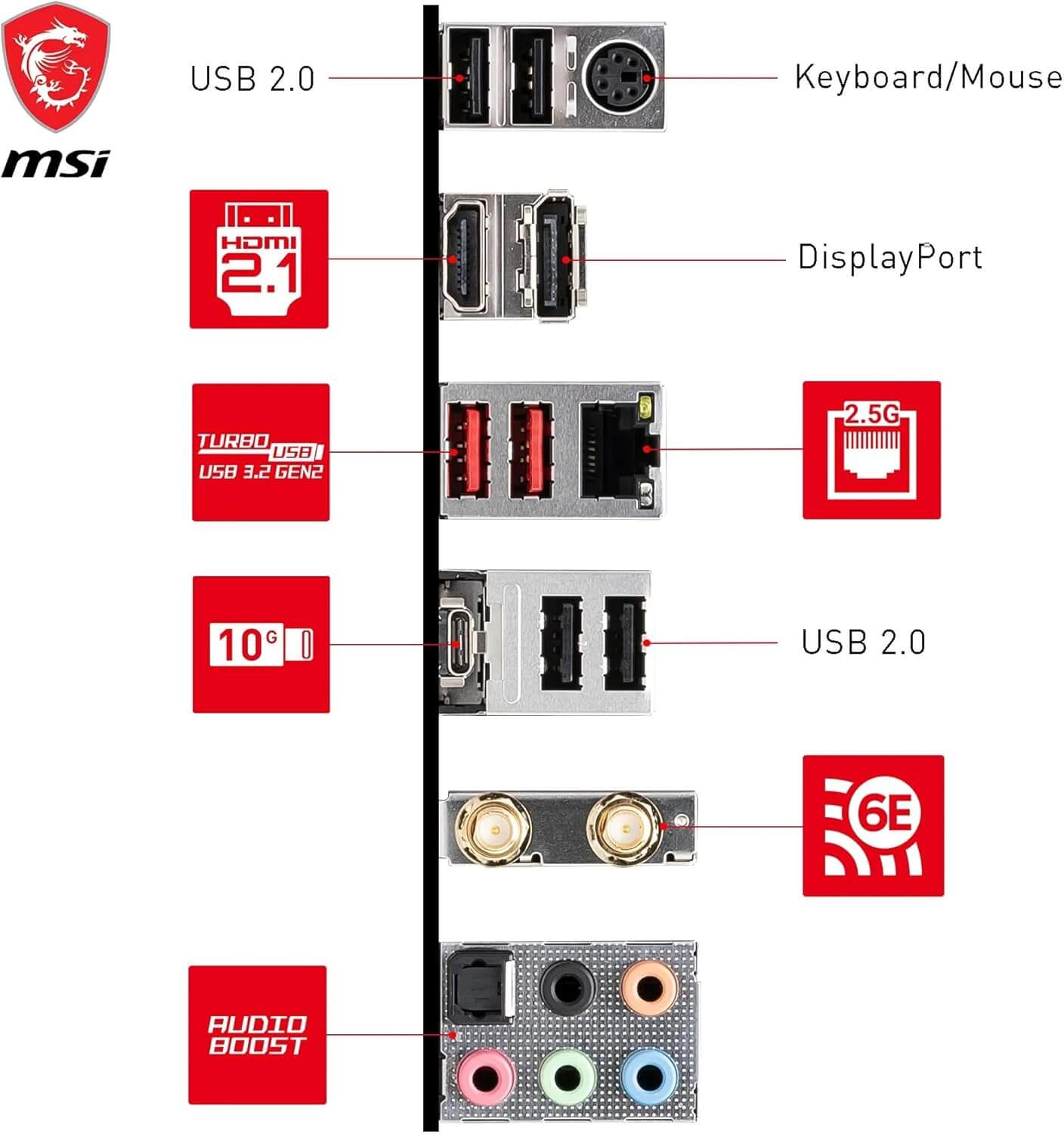 Ports and connectors of MSI B760 GAMING PLUS WIFI motherboard including USB, HDMI, DisplayPort, and Ethernet.